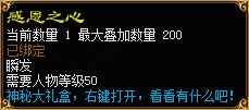 3.【感恩之心】大礼包打开有机率获得绑定的:【+10筋斗云(7天)】、【小火牛仙宠变身卷(永久)】、【女娲防具碎灵石(+7)】、【大块辉煌宝石】、【大块光芒宝石】等珍稀道具。