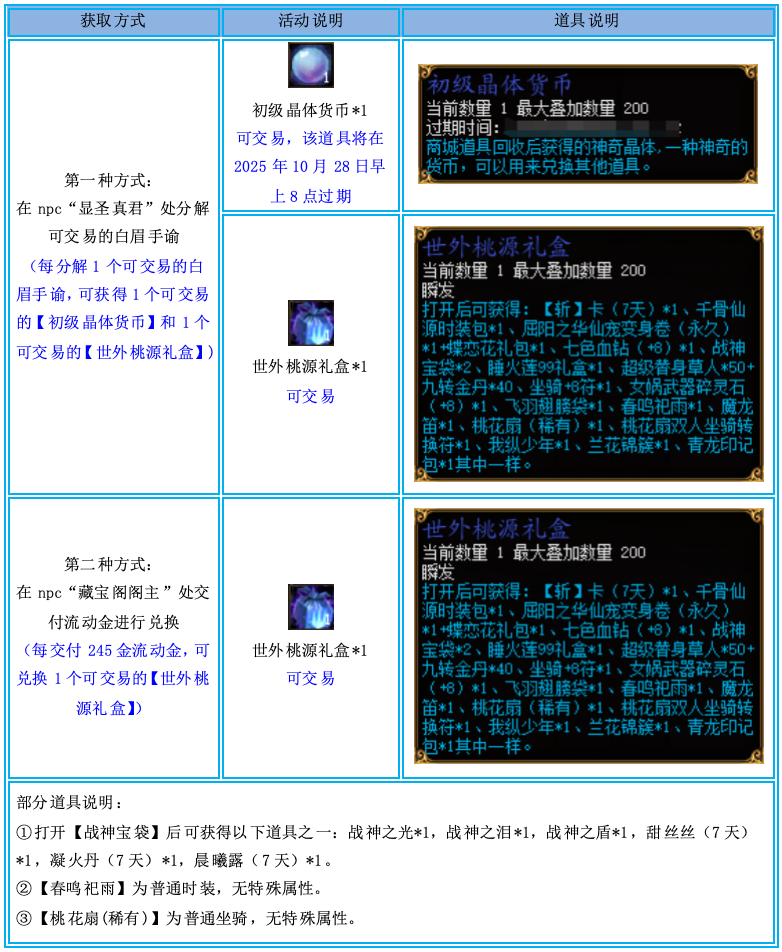 1、活动期间,可在成都npc“显圣真君”选择【道具分解】功能分解以下道具: