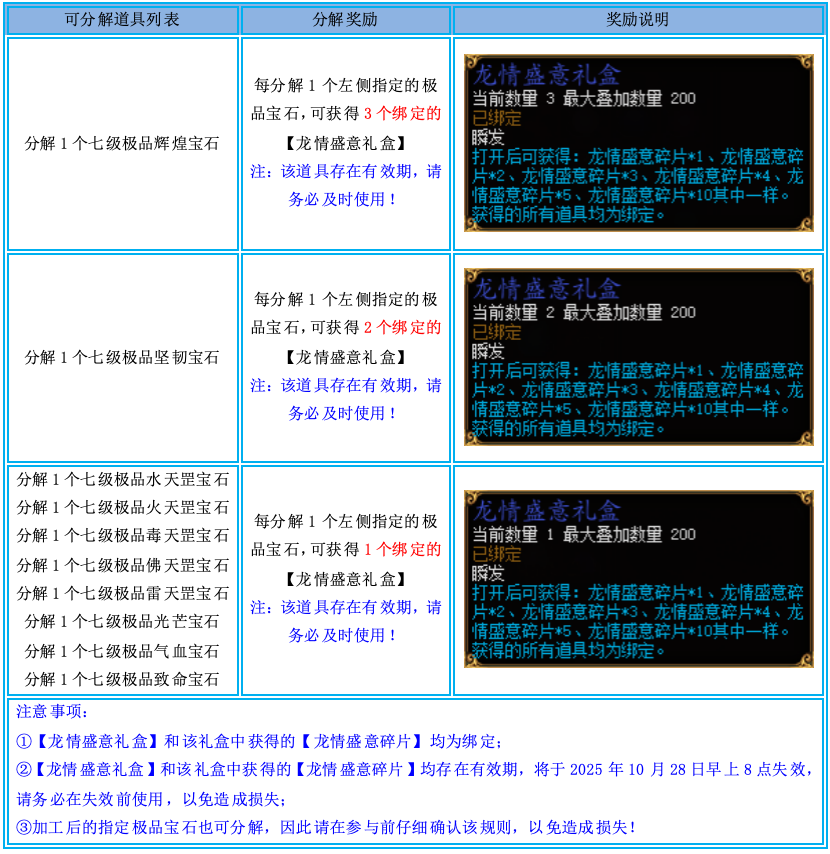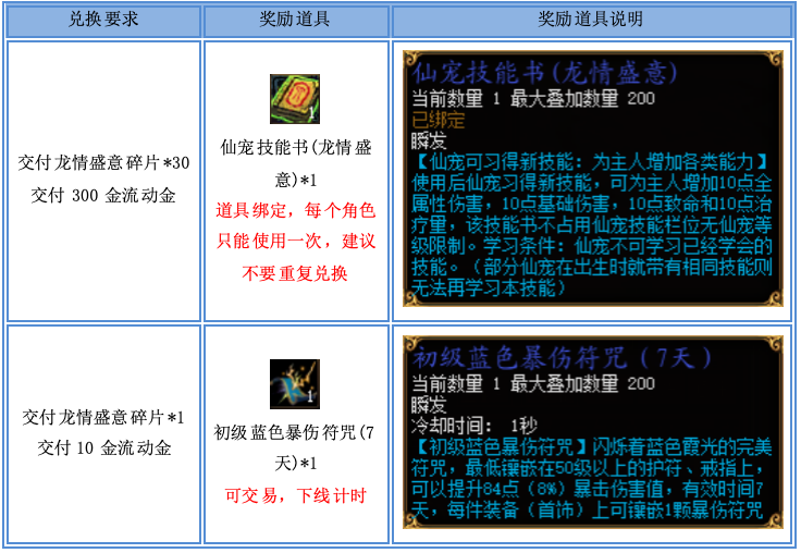 1、兑换奖励中的【仙宠技能书(龙情盛意)】为绑定,且每个角色只能使用1次,因此请勿重复兑换,以免造成损失;