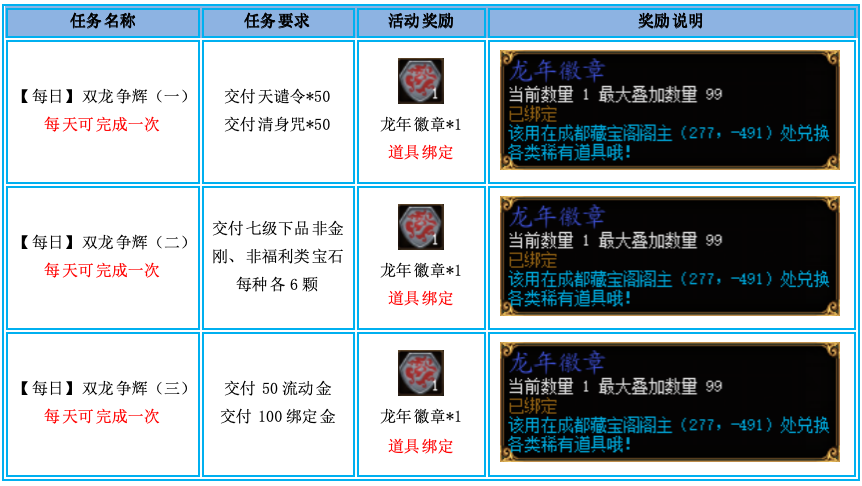 1、活动期间,成都城将会刷新活动npc“龙魅”,可与其对话接取相应活动任务(本次仅开放3个任务,请在参与时注意):