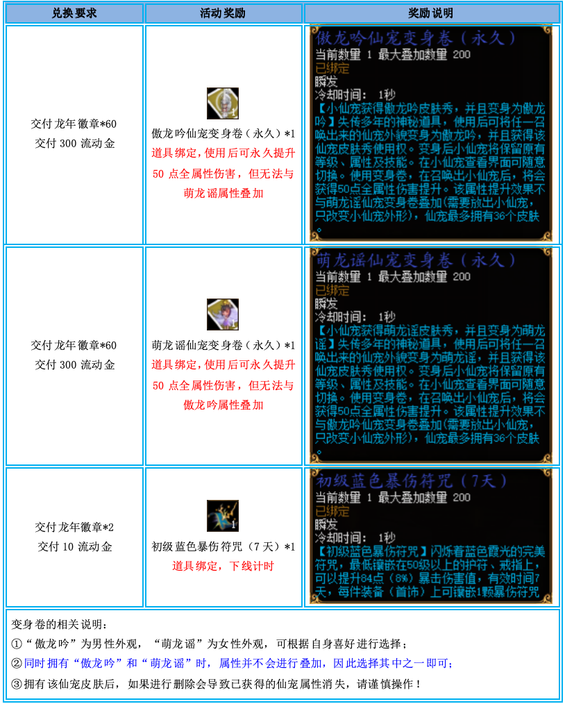 (请注意:初级蓝色暴伤符咒将在11月11日维护时下架,傲龙吟和萌龙谣的兑换暂不下架)