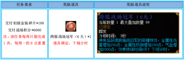 活动期间,将会临时开启跨服战场活动,等级达到61级的角色可接取以下任务(活动期间战场狂热者任务不开放):