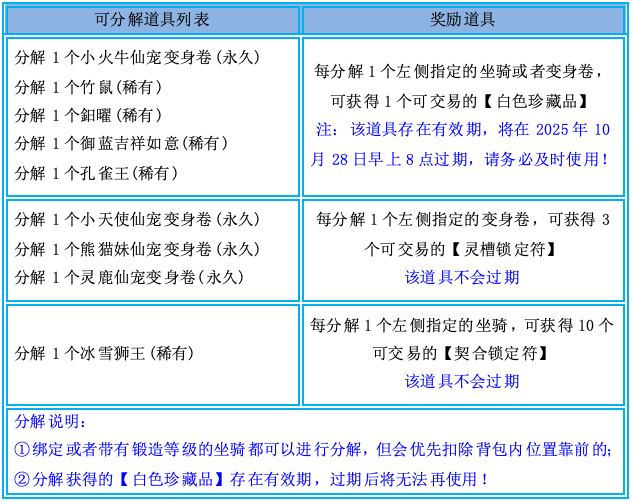1、活动期间,可在成都npc“显圣真君”处将以下道具进行分解: