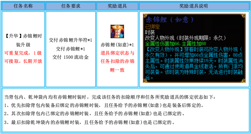 4、交付升级任务时,冰清灵翼的扣除顺序为:优先扣除背包内已绑定的,其次扣除背包内可交易的,最后扣除羽翼袋内的,请有需要的玩家务必看清任务说明再进行交易,以免造成损失;