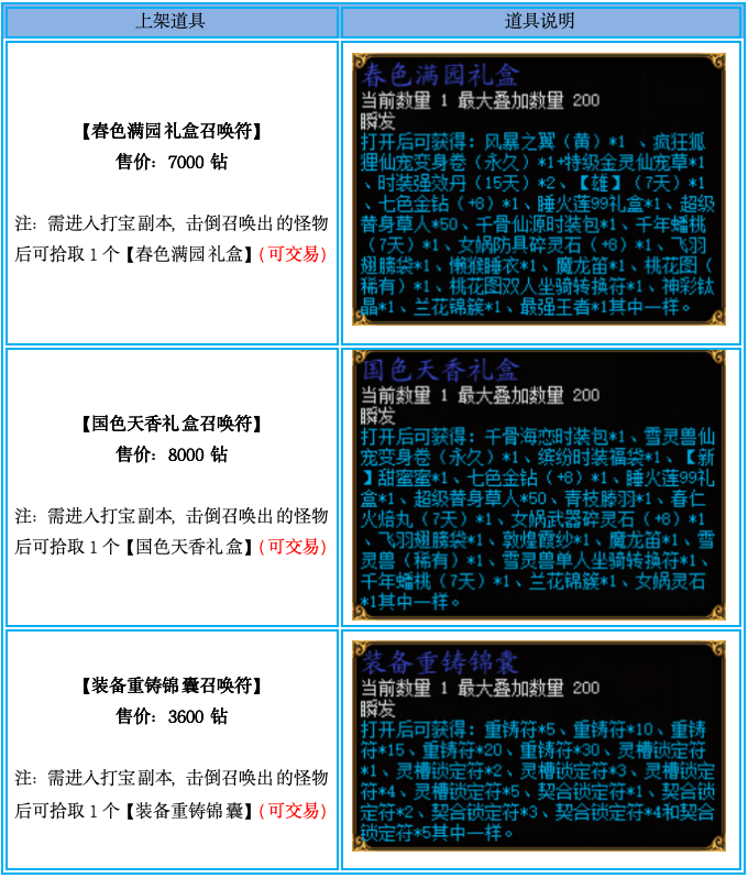活动期间,钻石商城将限时上架以下道具,切勿错失良机。