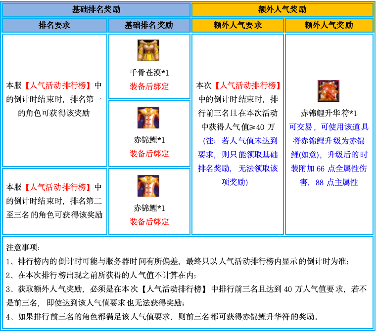2、本活动开启前,角色已经获得的人气值不会计算在内,必须要在活动开启后获得的人气值才为有效;