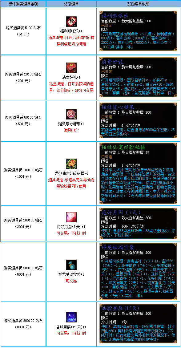 活动时间内,单一角色于钻石商城内购买道具,将根据钻石累计消费额度进行道具奖励