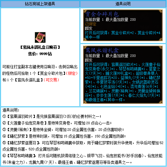 1、【鸾凤永谐礼盒召唤符】仅限钻石商城购买,通过摆摊购买、互相交易、邮件领取、拍卖购买等非钻石商城购买方式获得的,不计算在活动内;