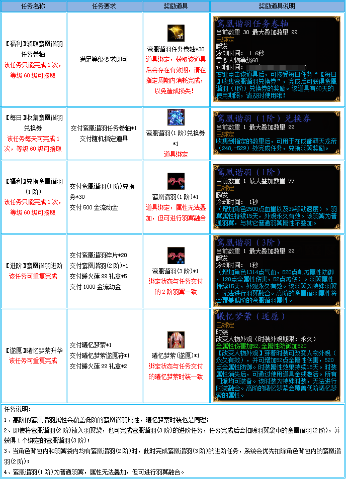 2、必须是在活动期间将鸾凰谐羽(3阶)放入羽翼袋才符合活动要求,非本次活动期间放入的无法获得奖励;