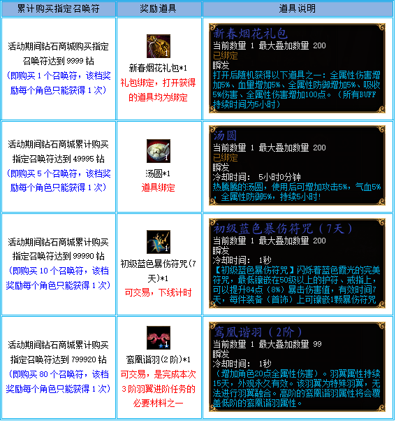 活动期间,单个角色在钻石商城累计购买【鸾凤永谐礼盒召唤符】达到以下指定要求可获得活动奖励,但每档奖励只能获得1次: