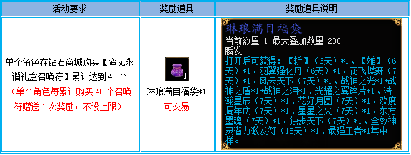 2、活动期间,单个角色在钻石商城每购买40个【鸾凤永谐礼盒召唤符】可获得一次奖励,不设上限。例如:玩家A活动期间在钻石商城购买了80个【鸾凤永谐礼盒召唤符】,则活动结束后可获得2个“琳琅满目福袋”;