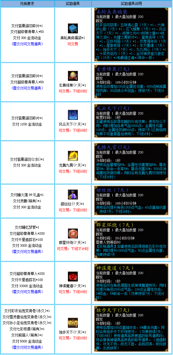 4、本次道具的兑换将在活动结束后下架,请有需要的玩家在此时间之前进行兑换,以免造成损失。