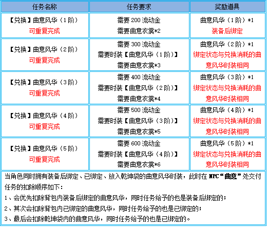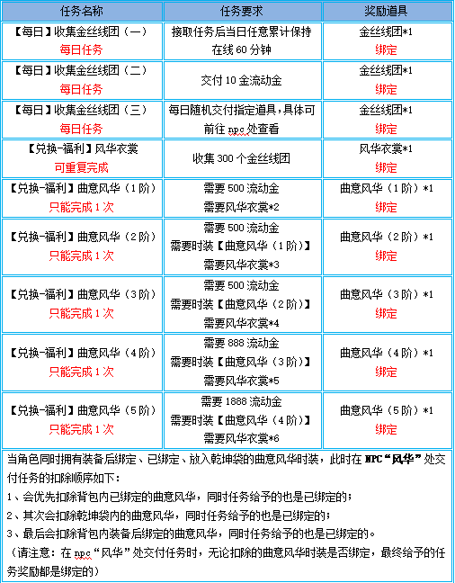 1、在npc“曲意”、“风华”处虽然都能接取时装任务,但是两个npc的任务需要交付的时装在扣除时的先后顺序并不相同,请至npc处仔细查看确认后再进行交付,以免造成损失;
