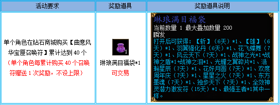 2、活动期间,单个角色在钻石商城每购买40个【曲意风华宝匣召唤符】可获得一次奖励,不设上限。例如:玩家A活动期间在钻石商城购买了80个【曲意风华宝匣召唤符】,则活动结束后可获得2个“琳琅满目福袋”;