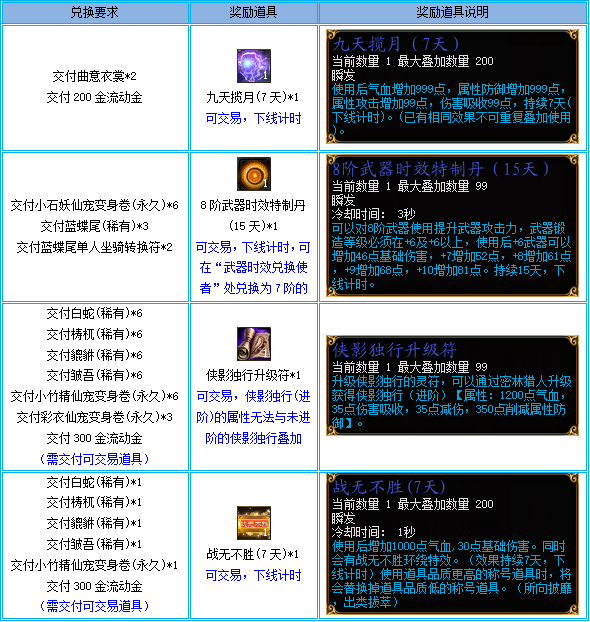 活动期间,可在NPC“藏宝阁阁主”处兑换以下各类道具:
