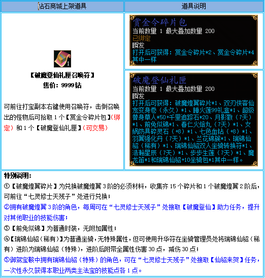2、【破魔登仙礼匣召唤符】仅限钻石商城购买,通过摆摊购买、互相交易、邮件领取、拍卖购买等非钻石商城购买方式获得的,均不计算在活动内;