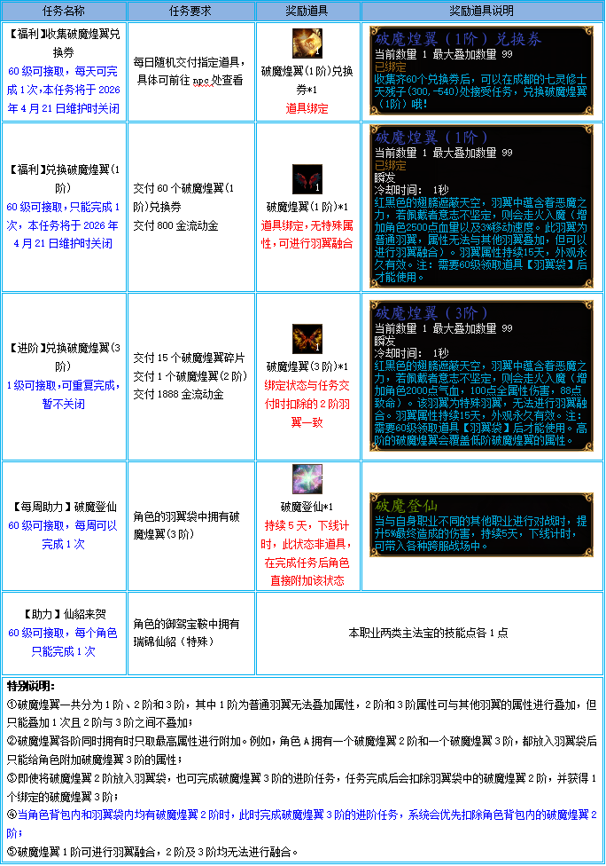 破魔煌翼(3阶):增加2000点气血,100点全属性伤害,88点致命,属性可与其他羽翼叠加,无法进行羽翼融合。