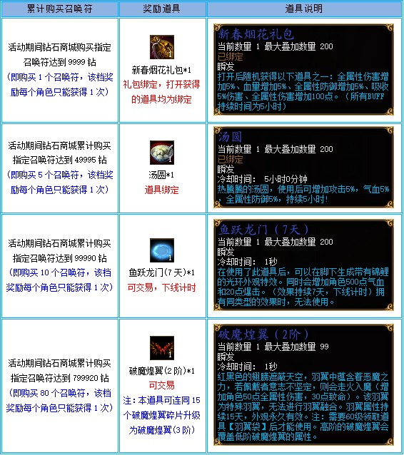 活动期间,单个角色在钻石商城累计购买【破魔登仙礼匣召唤符】达到以下指定要求可获得活动奖励,但每档奖励只能获得1次: