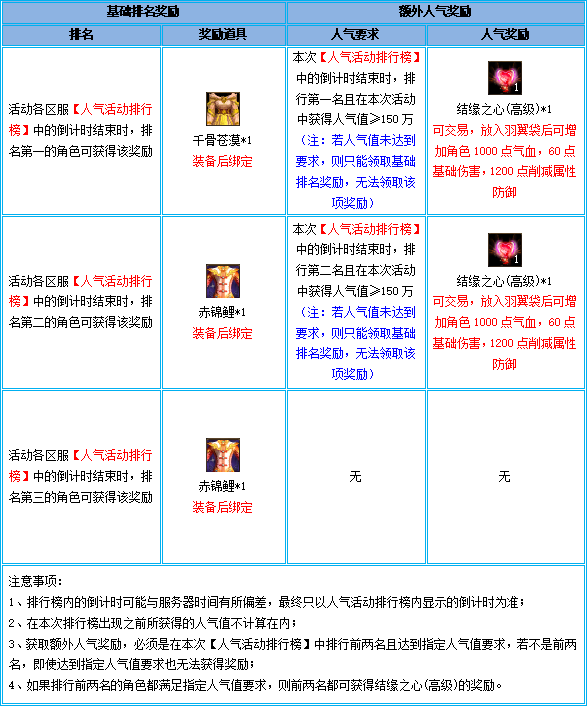 2、本活动开启前,角色已经获得的人气值不会计算在内,必须要在活动开启后获得的人气值才为有效;