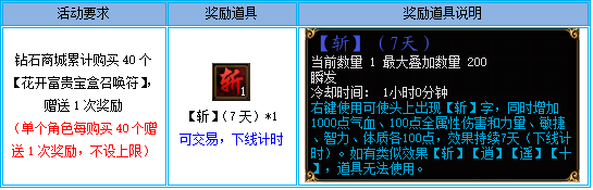 2、活动期间,单个角色在钻石商城每累计购买满40个【花开富贵宝盒召唤符】,可获得1个“【斩】(7天)”,不设上限。例如:玩家A在钻石商城购买了80个【花开富贵宝盒召唤符】,则可以获得2个“【斩】(7天)”的奖励;