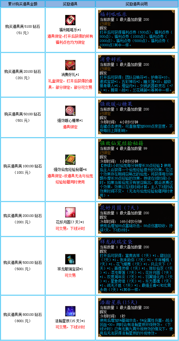 活动时间内,单一角色于钻石商城内购买道具,将根据钻石累计消费额度进行道具奖励