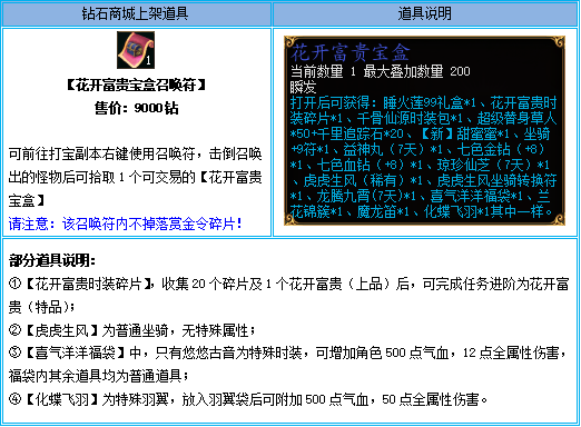 活动期间,钻石商城将限时上架【花开富贵宝盒召唤符】,切勿错失良机!