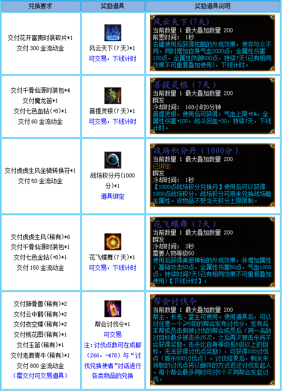 活动期间,可在NPC“藏宝阁阁主”处兑换以下道具: