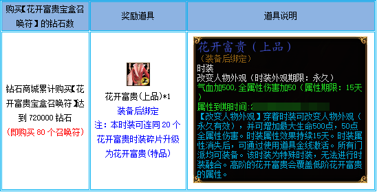 活动期间,单个角色在钻石商城累计购买【花开富贵宝盒召唤符】达到指定钻石数可获得活动奖励: