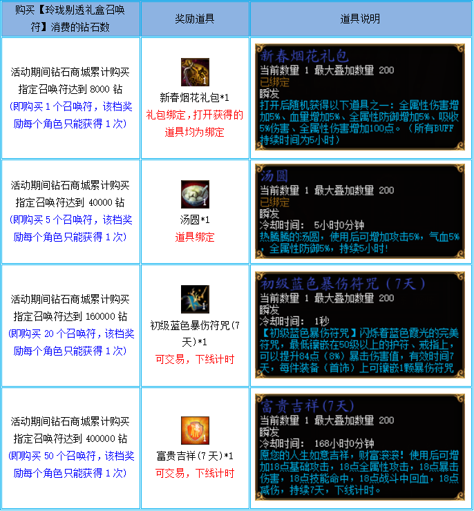 活动期间,单个角色在钻石商城累计购买【玲珑剔透礼盒召唤符】达到指定要求的钻石数量后可获得活动奖励,但每档奖励只能获得1次