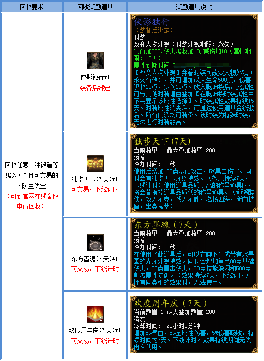 2、需要交付的7阶主法宝必须为锻造+10且可交易(带有转移时间也不影响回收),已绑定的或者非锻造+10的无法参与本次活动;