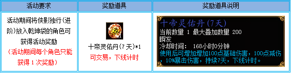 2、必须是在活动期间将侠影独行(进阶)放入乾坤袋才符合要求,非本次活动期间放入的无法获得奖励;
