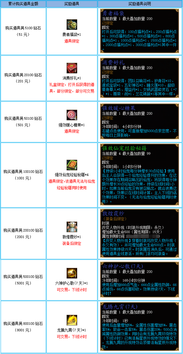 活动时间内,单一角色于钻石商城内购买道具,将根据钻石累计消费额度进行道具奖励。