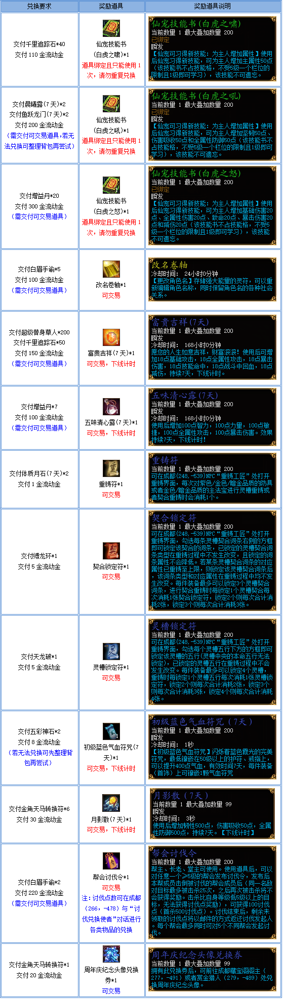 2、兑换获得的道具中,除【白虎之啸】、【白虎之吼】、【白虎之怒】这三本技能书为绑定,其余道具均可进行交易;