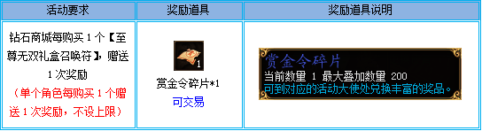2、活动期间,单个角色在钻石商城每购买1个【至尊无双礼盒召唤符】,可获得1个“赏金令碎片”,不设上限。例如:玩家A在钻石商城购买了90个【至尊无双礼盒召唤符】,则可以获得90个“赏金令碎片”的奖励;