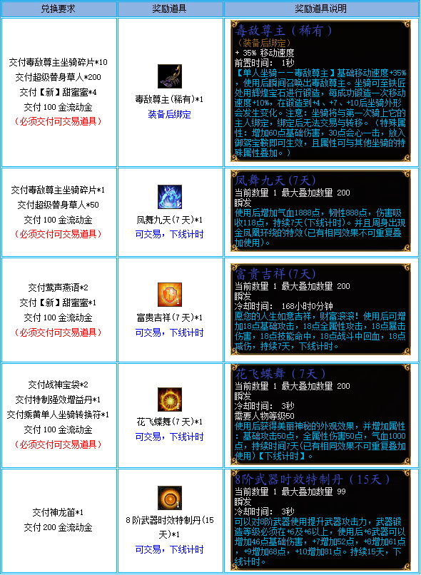 活动期间,可前往npc“藏宝阁阁主”处兑换以下道具: