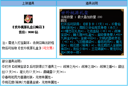 1、【世外桃源礼盒召唤符】仅限钻石商城购买,通过摆摊购买、互相交易、邮件领取、拍卖购买等非钻石商城购买方式获得的,不计算在活动内;