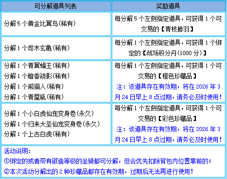 2、活动结束后,本次指定的道具将无法再进行分解,请有需要的玩家抓紧时间参与;