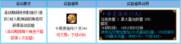 2、必须是在活动期间将侠影独行(进阶)放入乾坤袋才符合要求,非本次活动期间放入的无法获得奖励;