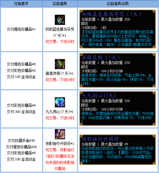 1、活动期间与“藏宝阁阁主”对话可兑换以下各类道具:
