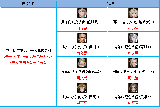 4、本次上架的道具中,除了周年庆纪念头像暂不下架外,其余道具将在活动结束后下架,若有需要还请尽快兑换。