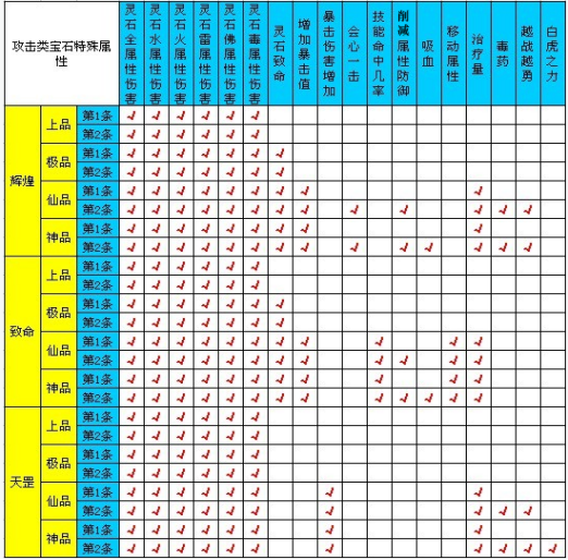 不同品质、类型宝石可获得的特殊属性不同,具体对照如下表格。表格中第1条表示宝石属性界面特殊属性第一条属性,第2条栏表示宝石特殊属性第二条属性。